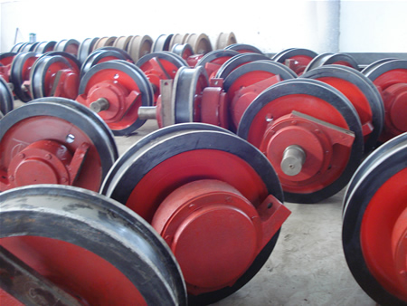 起重机车轮组是由车轮与轴、轴承和轴承箱等组成的机械设备。起重机车轮组一般是用来车支承起重机和载荷的,同时在规定轨道上让起重机进行往复行驶运行的装置。起重机车轮组应用比较复杂,是根据不同的产品结构,采用不同的技术方法。不过起重机车轮组的应用重心还是控制运行起重机车轮组的车轮水平偏斜值。在日程工作中比较常用、工艺措施也相对比较简单的设计结构是:将车轮装配到支架上组成起重机车轮组。