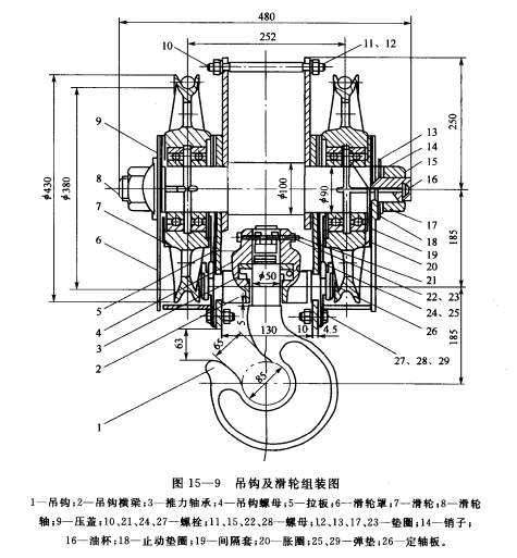 1一滑轮,2一轴承,3一滑轮轴,4一滑轮外罩,5一吊钩,6一吊钩横梁,7一推力轴承,8一吊钩螺母,9一拉板。